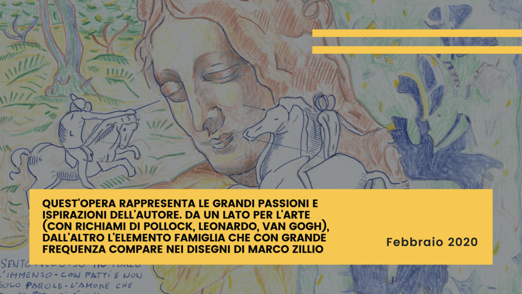 Il disegno rappresenta le grandi passioni e ispirazioni dell’autore. Da un lato per l’arte (con richiami di Pollock, Leonardo, Van Gogh), dall’altro l’elemento famiglia che con grande frequenza compare nei suoi disegni.