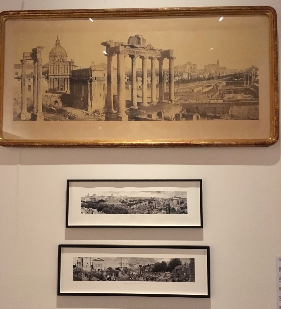 Bella la stampa all’albume della seconda metà del diciannovesimomo secolo di Cuccioni, la Veduta dal Foro romano. Interessanti anche due stampe digitali di Masumaya, la Veduta di Campo Vaccino e la Veduta del Foro Romano. Le tre opere sono raccolte nell’immagine che segue.