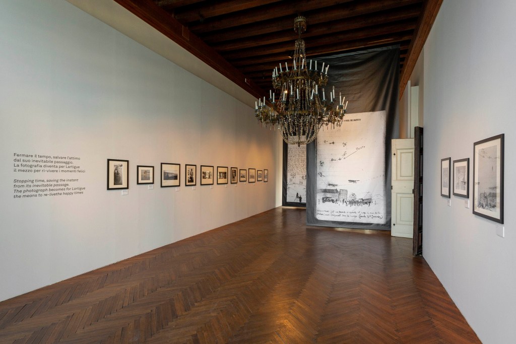 Verranno così svelati dettagli ancora inediti del percorso espositivo che, attraverso 120 immagini – di cui 55 inedite – ripercorre la storia di Lartigue e la sua ricerca ossessiva della felicità e della bellezza. In particolare saranno pubblicate le foto dell’originale allestimento, che mette in scena le gigantografie di alcune pagine dei diari personali e dei 126 album realizzati da Lartigue con i suoi disegni e le sue riflessioni.
