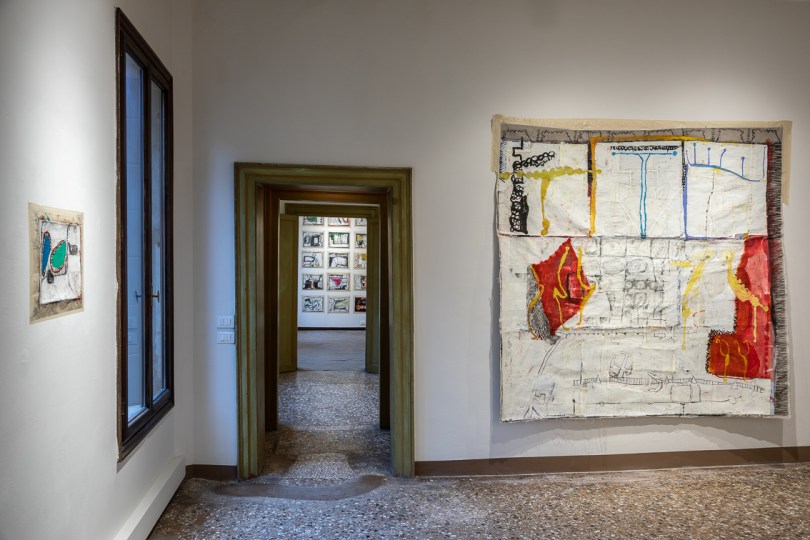 Così, per chi conosce il lavoro di questo artista, sa che la sofferenza, l’angoscia, il tormento si sono imposti a lungo quali motori della sua ricerca di senso. In questa mostra però, nella densa stratificazione del colore cupo che oscura tutto, sotto una spessa coltre, hanno trovato largo ampi squarci di luce: intere porzioni di tela lasciate vuote e bianche. Dal fragore linguistico dei quadri precedenti, dove colore, parole, grafismi e materiali si condensano contaminandosi l’uno con l’altro, in uno straziante lamento che emerge dalla tela, in questa serie di ultime opere si incontra uno spazio silenzioso e la pittura diventa un sollievo dal dolore e una pausa dalla battaglia quotidiana.