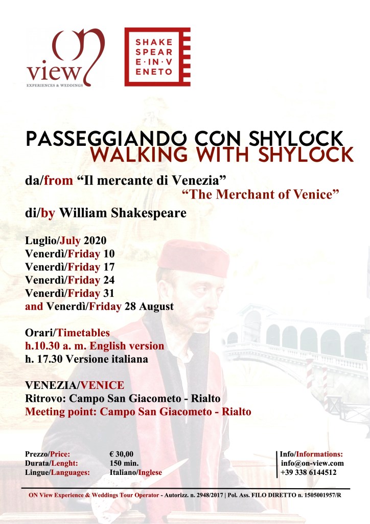 L’usuraio, in questa fiabesca visita guidata, farà scoprire la “sua” Venezia, anzi, la Venezia di Shakespeare, con un percorso da Rialto al Ghetto.