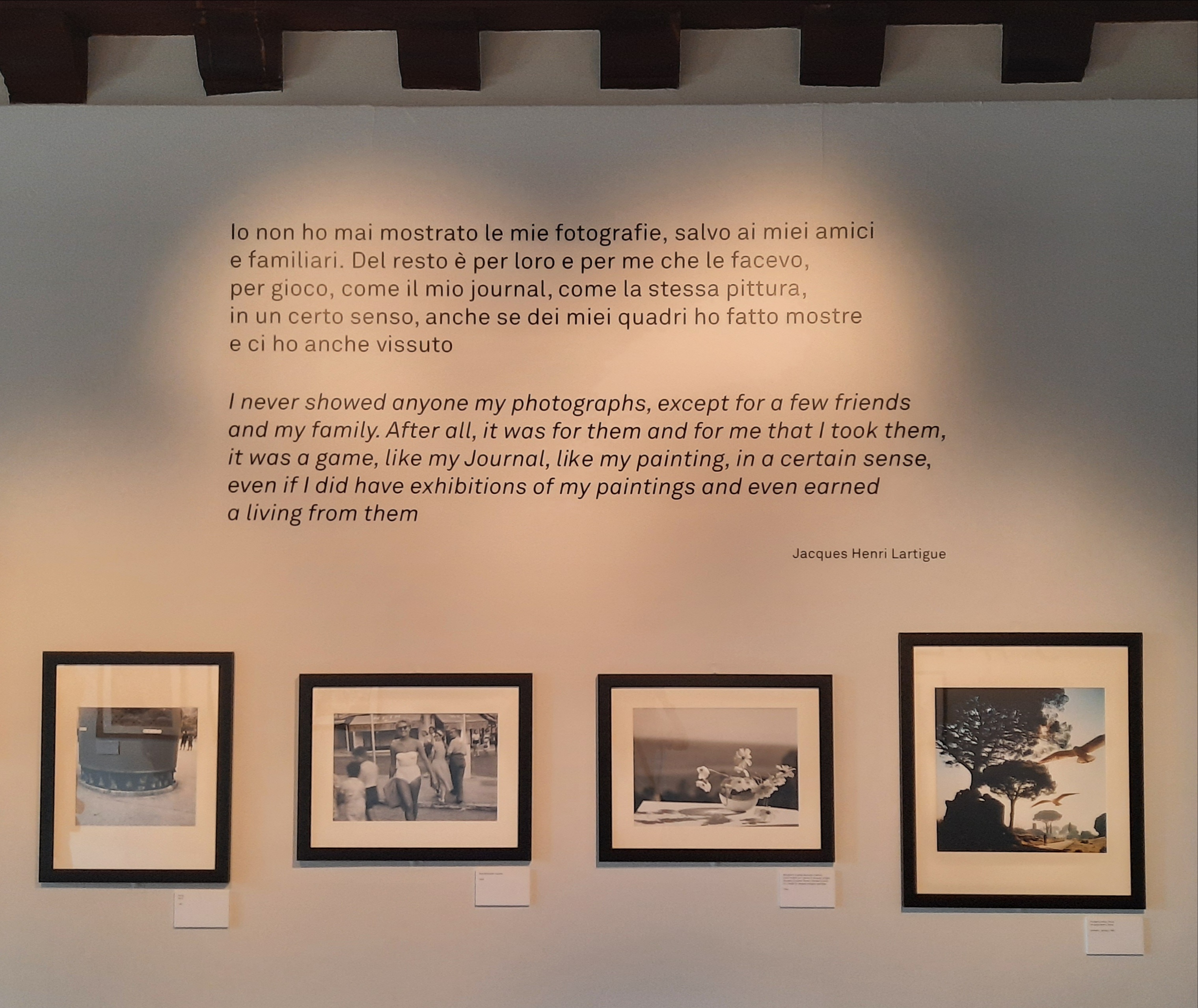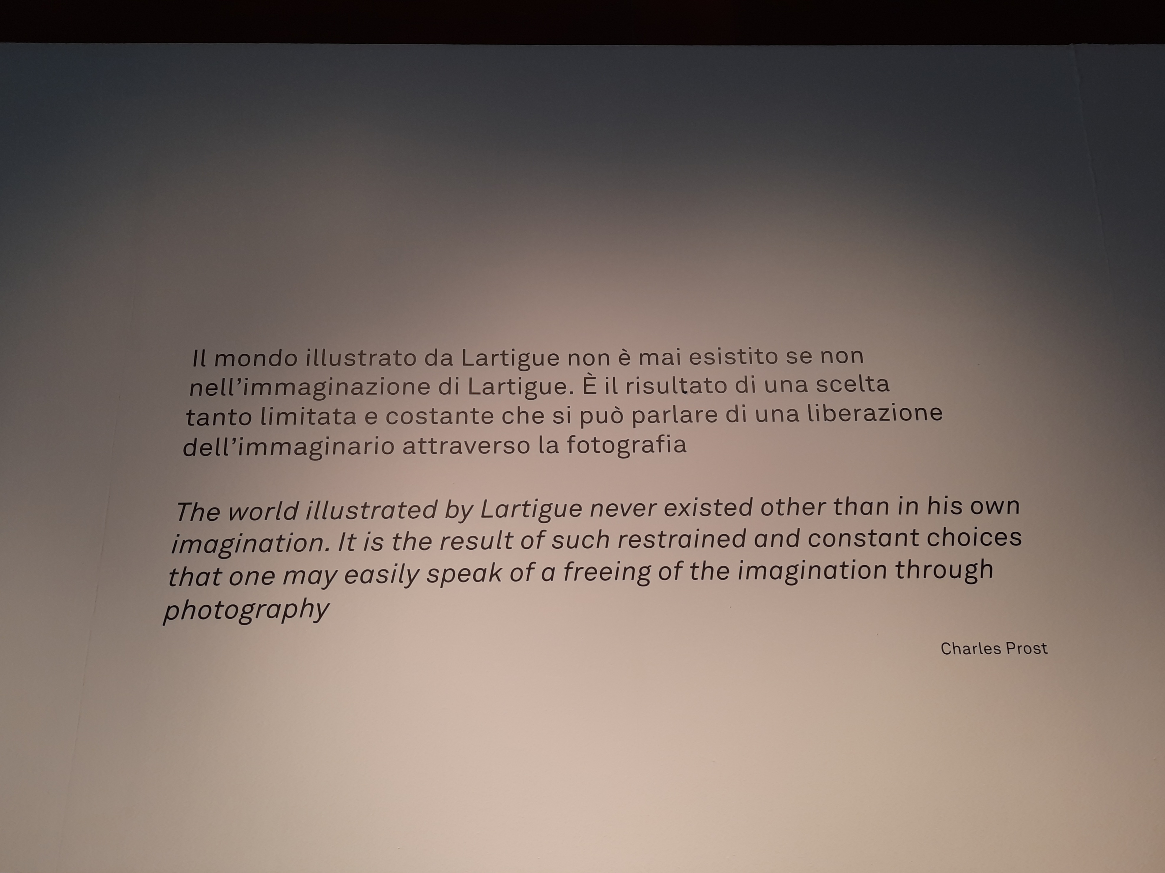 “La ‘parte di mondo’ di Lartigue è quella di una Parigi ricca e borghese del nouveau siècle, e anche quando l’Europa verrà attraversata dagli orrori delle due guerre mondiali, Lartigue continuerà a preservare la purezza del suo microcosmo fotografico, continuando a fissare sulla pellicola solo ciò che vuole ricordare, conservare. Fermare il tempo, salvare l’attimo dal suo inevitabile passaggio. La fotografia diventa per Lartigue il mezzo per riesumare la vita, per rivivere i momenti felici, ancora e ancora”.