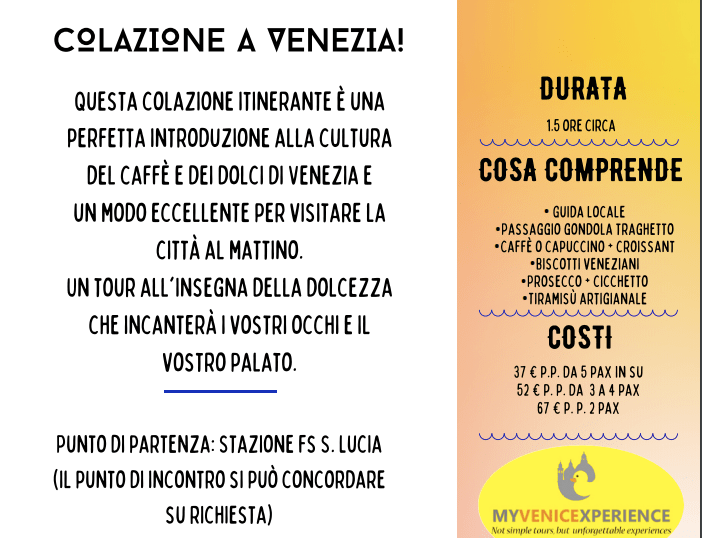 - COLAZIONE A VENEZIA: il fascino della Venezia del mattino, degustando la colazione girando per le sue bellezze
