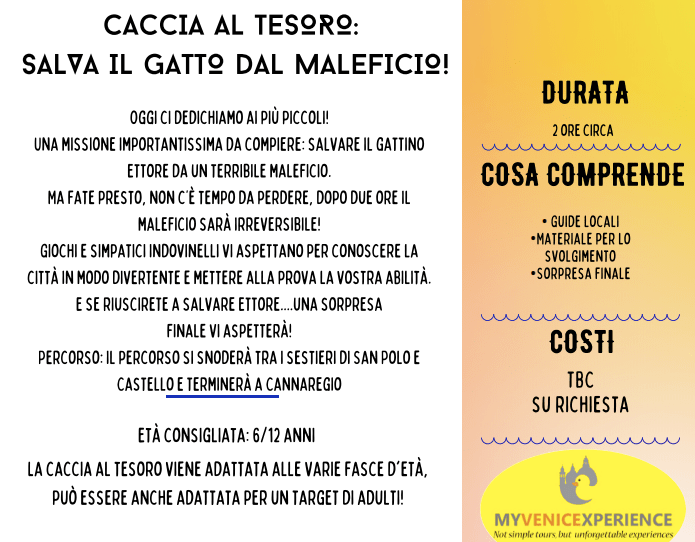 - CACCIA AL TESORO SALVA IL GATTO DAL MALEFICIO! Un tour pensato per i bambini dai 6 ai 12 anni ma che può essere adattato anche per gli adulti. Giochi e indovinelli per scoprire Venezia divertendosi e… salvando il gatto Ettore!