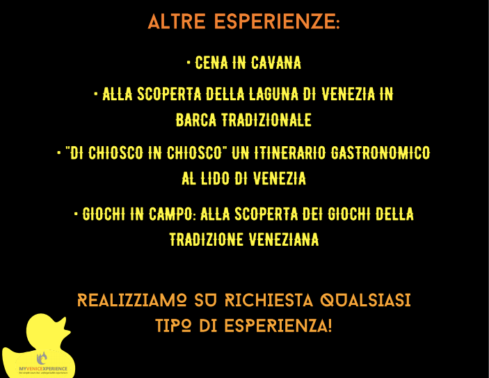 Oltre a quelle elencate ci sono molte altre attività a disposizione per i curiosi che vogliono avvicinarsi a Venezia in un modo diverso: scoprire Venezia dall’alto, i tour in barca al tramonto, i picnic chic e romantici, le passeggiate a Chioggia, a Pellestrina, la scoperta di Malamocco, le cene letterarie in cavana, … Insomma, non c’è che l’imbarazzo della scelta, e se non trovate elencato il tour dei vostri sogni le ragazze di Myvenicexperience ve lo costruiscono su misura.