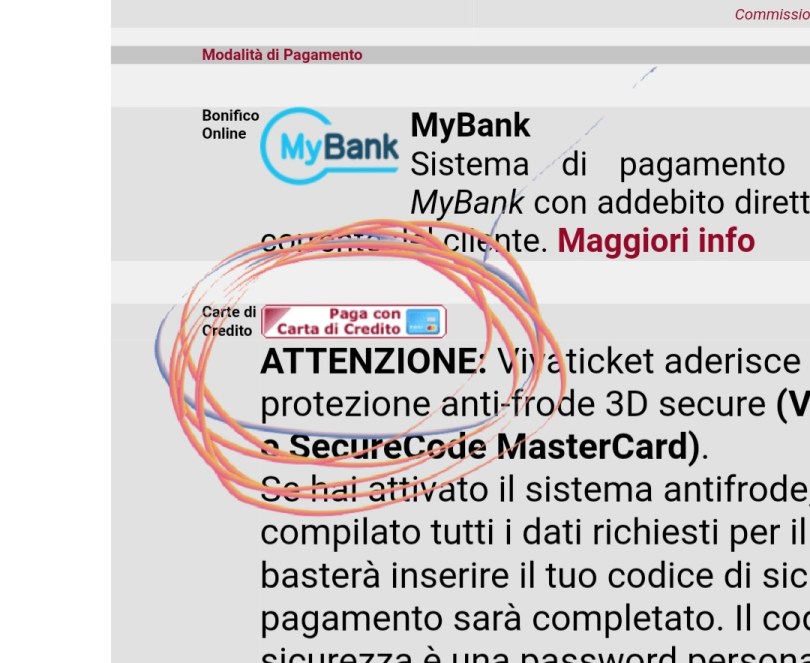Qui vi consiglio di ingrandire la parte in alto a sinistra della schermata, per rendere più facilmente visibili i pulsantini MyBank per chi volesse pagare con bonifico on-line, o Paga con carta di credito per chi volesse pagare, appunto, con carta di credito.