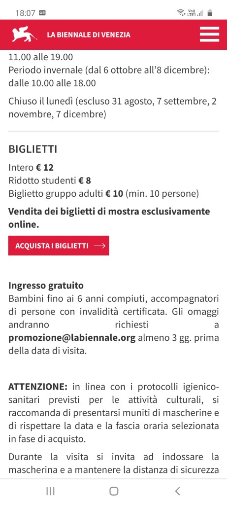 - Ingresso gratuito per bambini fino ai 6 anni compiuti, accompagnatori di persone con invalidità certificata. Gli omaggi andranno richiesti a promozione@labiennale.org almeno 3 giorni prima della data di visita
