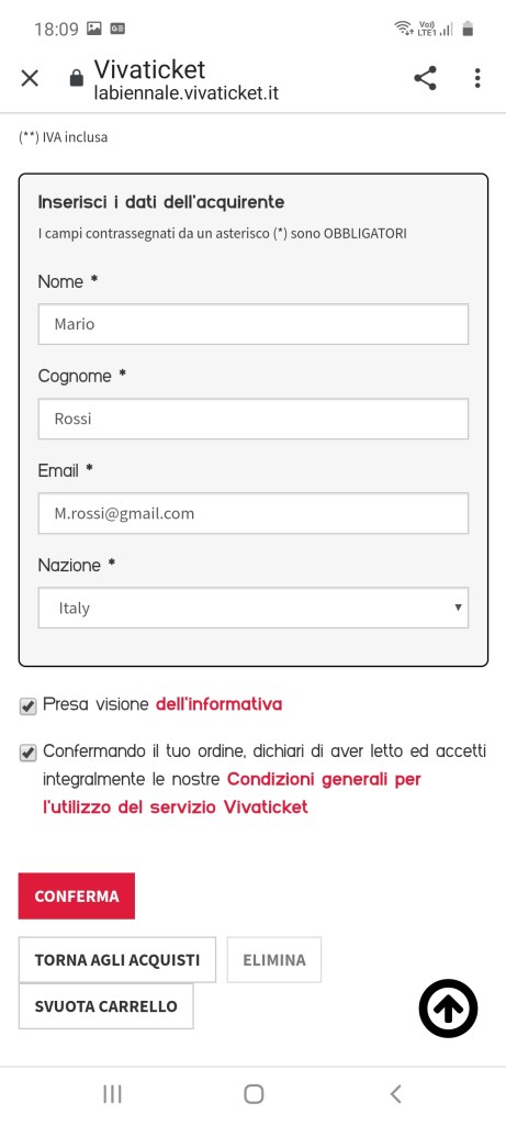 Completati i dati per tutti i visitatori toccherà quindi passare alla compilazione della scheda dei dati dell’acquirente (colui che effettivamente procederà con l’acquisto dei biglietti) e mettere i segni di spunta dove richiesto.