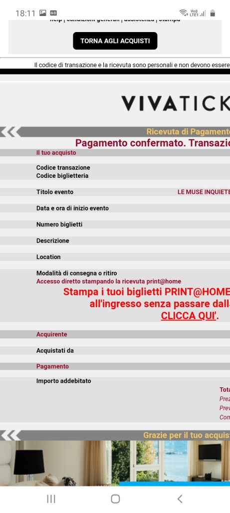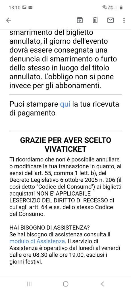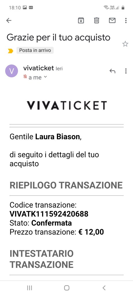 Qui dovrebbe esservi arrivato NON il biglietto, ma la ricevuta di acquisto, in una mail dall’oggetto Grazie per il tuo acquisto, proveniente da VivaTicket: