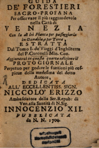 Mi è venuto un brivido a vedere questo “regalo” che ci ha fatto su Facebook Pieralvise Zorzi (se non lo seguite ancora fatelo subito!): la guida di Vincenzo Coronelli “Guida de’ Forestieri Sacro-Profana”. E già dal titolo molto si intuisce sull’approccio diverso dei viaggiatori e di chi si proponeva di guidarli alla scoperta delle bellezze del luogo.