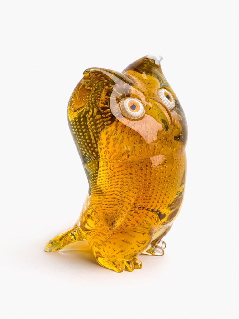Civetta in vetro ambra con occhi a murrina, anni ottanta