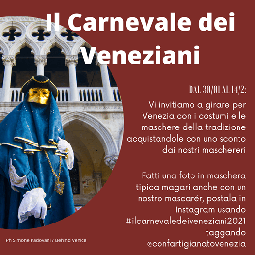 L’iniziativa centrale è un concorso che prevede di farsi scattare una foto in maschera tipica veneziana e postarla su Instagram usando l’hashtag #ilcarnevaledeiveneziani2021, taggando Confartigianato Venezia.
