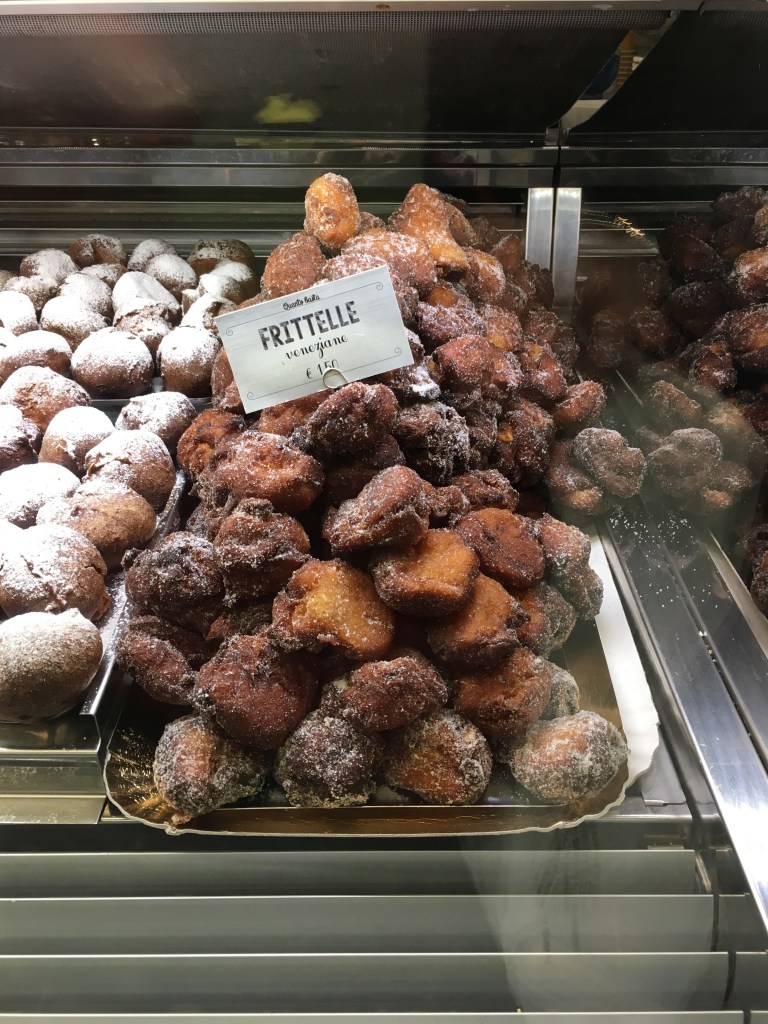 Suggerisco anche un’opzione integrativa: uno dei miei bar preferiti per gli spuntini ristoratori è il Bar Tiziano, in Strada Nuova poco prima del Fontego dei Tedeschi e di Rialto. Ecco, dopo aver gustato uno (o più) dei loro ricchissimi tramezzini mi piace regalarmi una fritoła. Perfetta come dessert!