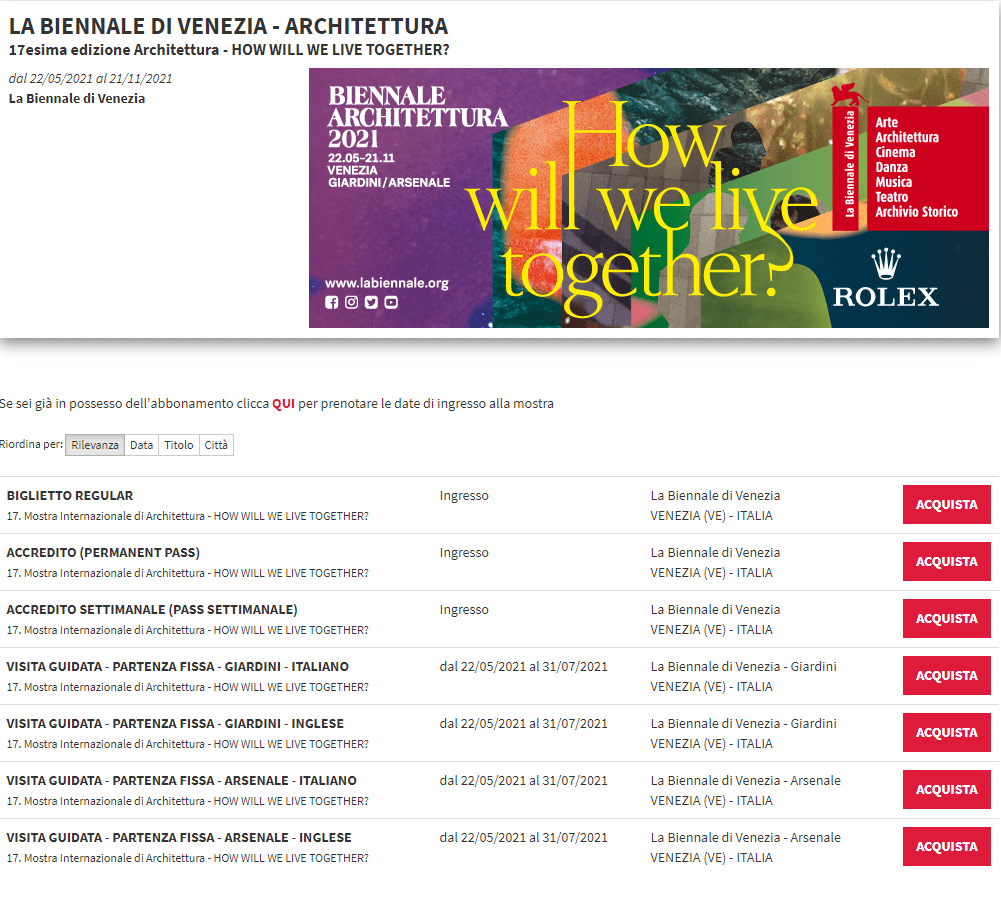 Intanto la pagina principale della biglietteria è raggiungibile a questo indirizzo https://www.labiennale.org/it/architettura/2021/informazioni#tickets
