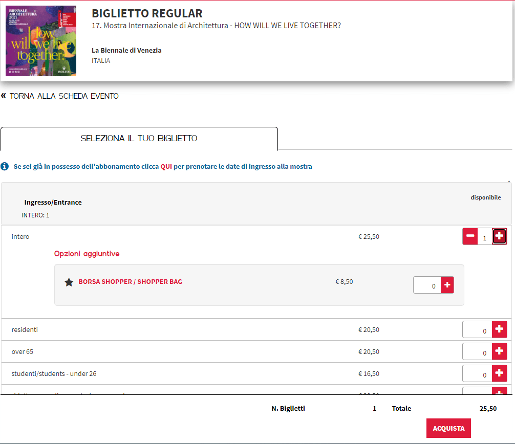 Premere nuovamente ACQUISTA per confermare il tipo di biglietto. Si viene portati in una pagina in cui scegliere il numero di biglietti per le diverse tipologie (in una seconda fase verranno chiesti i nomi degli intestatari)