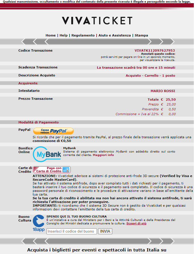 Nella pagina della biglietteria vengono presentate le diverse opzioni d’acquisto