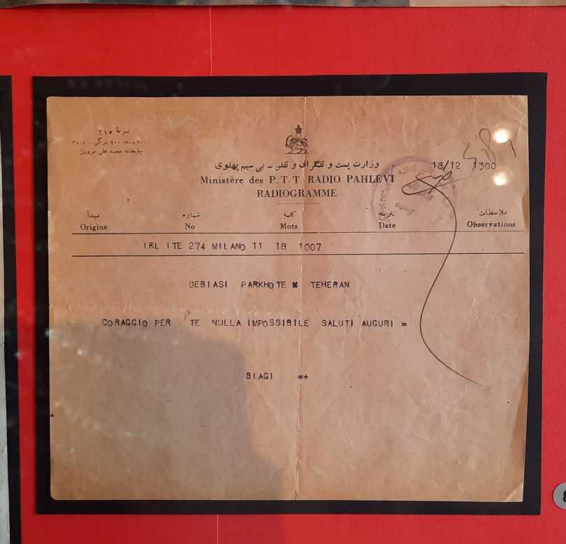 Tra gli altri reperti straordinari presenti in mostra mi ha colpito un telegramma che Enzo Biagi scrive per incitare uno sconfortato Mario de Biasi inviato a Teheran per il matrimonio dello Scià.
