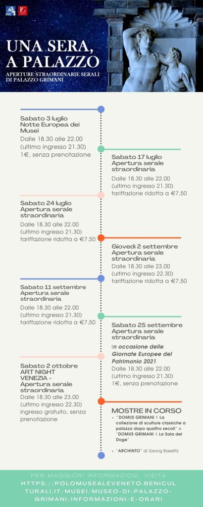 Il 17 e il 24 luglio, e ancora il 2, l’11 il 25 settembre e il 2 ottobre, con orari diversi e tariffe diverse sarà possibile accedere allo splendido palazzo e alle mostre attualmente in corso dalle 18.30 in poi.