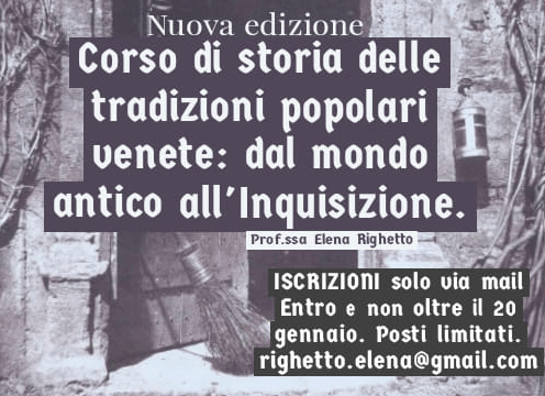 Il programma del corso si basa sullo studio storico dall’evoluzione dei culti pagani venetico/romani alle festività e tradizioni cristiane, dall’antichità all’Inquisizione Veneziana di metà 1500.