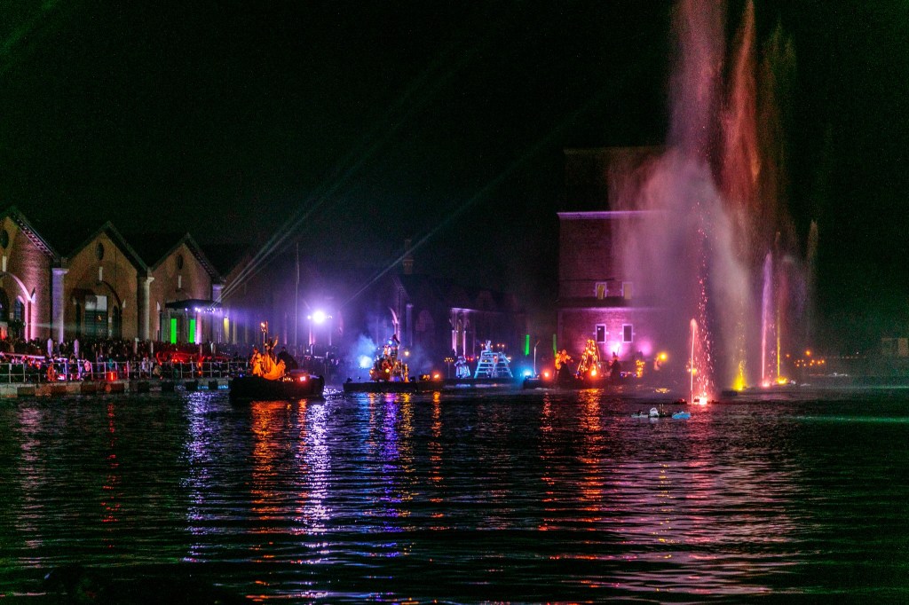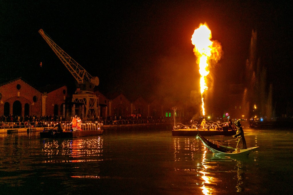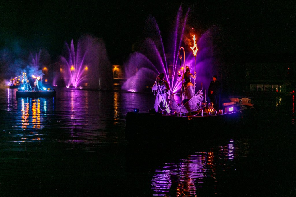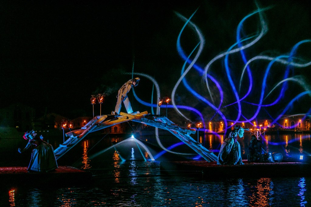 Lo spettacolo è di una bellezza che toglie il fiato. Giochi di luce, di fuoco, di musica, con performer e ballerini che scorrono sulle acque tranquille del bacino dell’Arsenale.