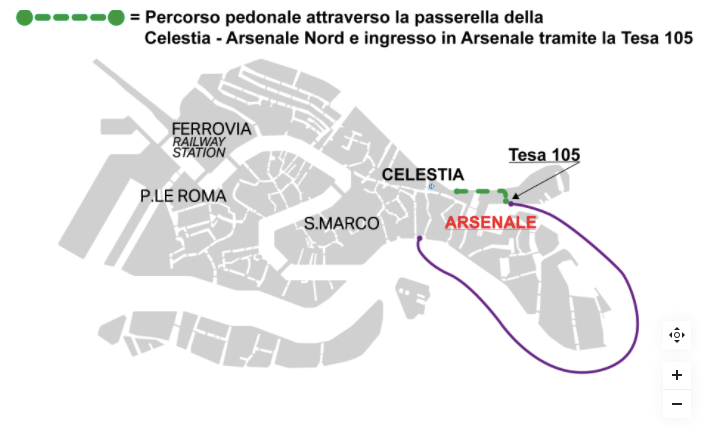 Fermata Celestia (informate il marinaio del fatto che volete scendere a Celestia quando salite sul vaporetto, perché è una fermata a richiesta). Ingresso pedonale attraverso la passerella della Celestia – Arsenale Nord e ingresso in Arsenale tramite la Tesa 105