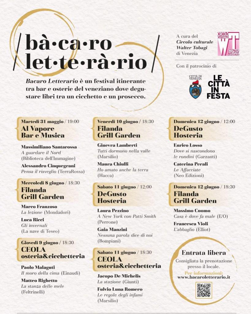 Dopo il Grand Central Literary Festival è la volta del Bàcaro letteràrio, un “festival itinerante tra bar e osterie del veneziano dove degustare libri tra un cicchetto e un prosecco“, come recita il sottotitolo della manifestazione.