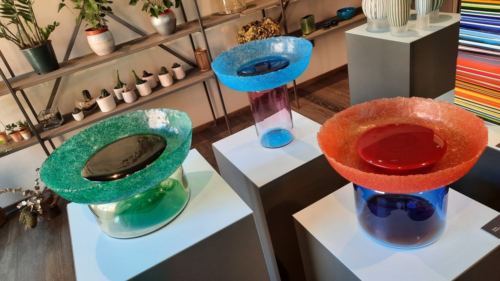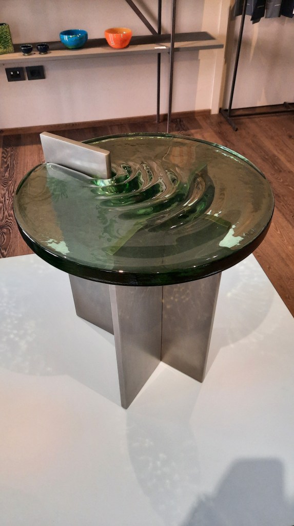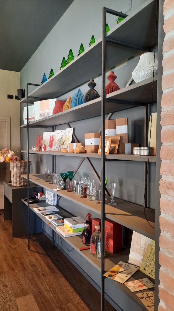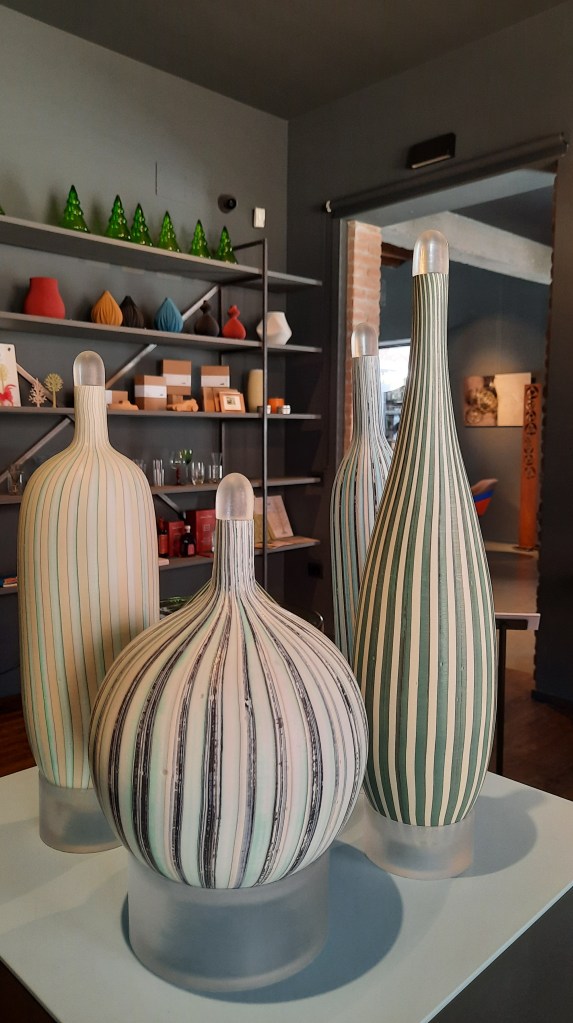 Io ci sono stata all’inizio di luglio e sono rimasta davvero entusiasta della scoperta! Vi ho trovato l’esposizione temporanea “Le forme del bere“, visitabile fino al 31 dicembre, con una raccolta di bicchieri che hanno fatto la storia dell’arte del vetro e progetti di design futuro e futuribile. Ho pranzato – ottimamente – al Vetri Restaurant godendomi il buon cibo e la splendida vista, e mi sono lasciata andare in un po’ di sano shopping all’InGalleria Shop, riconoscendo tra le proposte in vendita anche quelle di diversi artigiani-artisti da me molto apprezzati.