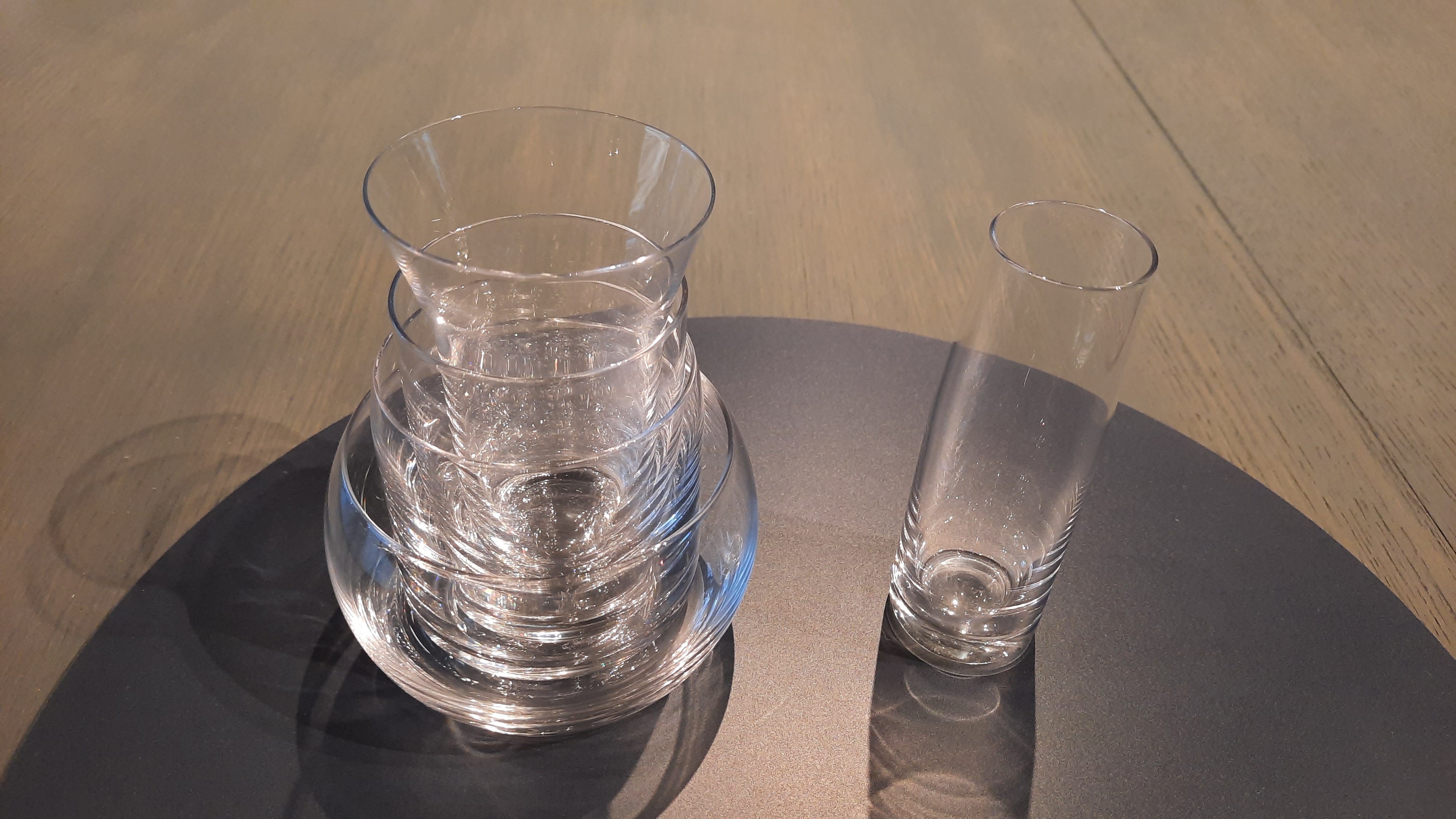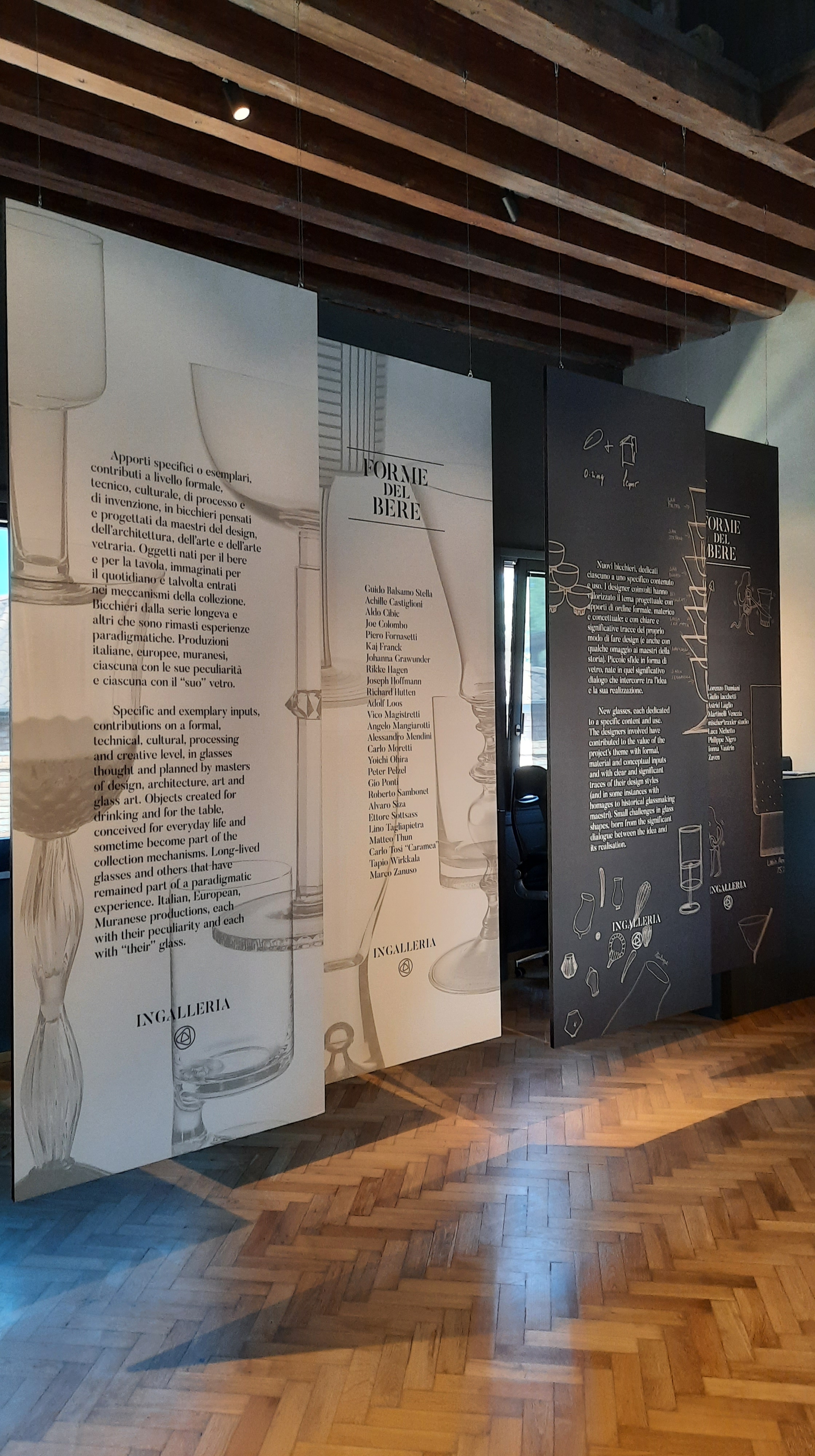 Idealmente divisa in due sezioni – una calata nel contemporaneo con nove bicchieri disegnati per l’occasione da altrettanti progettisti internazionali e realizzati a Murano; e una riferita alla storia recente del bicchiere, il XX secolo, che mostra un possibile lessico di riferimento in cui convergono progetti di designer internazionali e diproduttori italiani, muranesi, europei – la mostra testimonia, attraverso una cinquantina di “forme del bere”, alcune tra le possibili e valide modalità diaffrontare e declinare un piccolo oggetto della quotidianità.