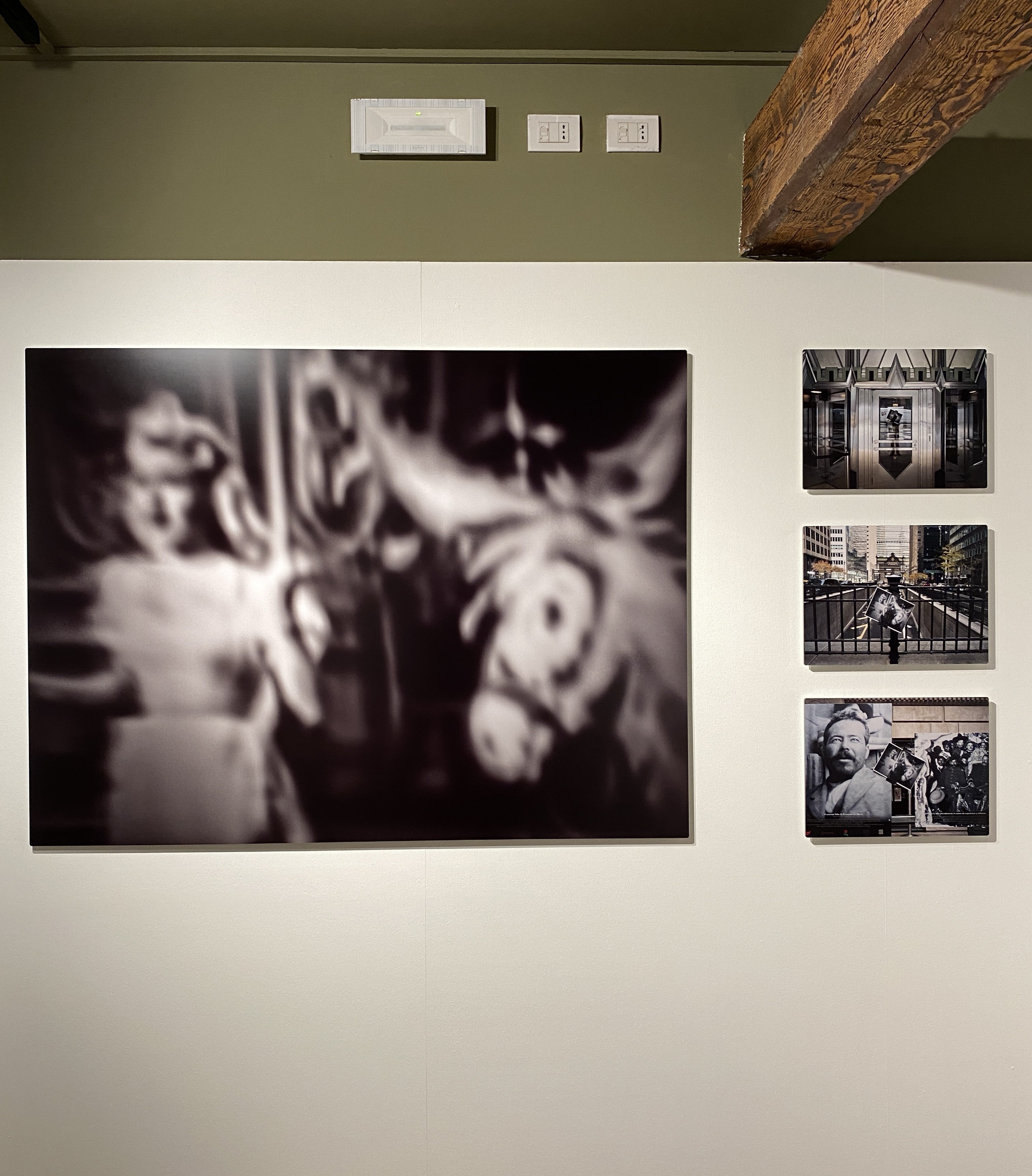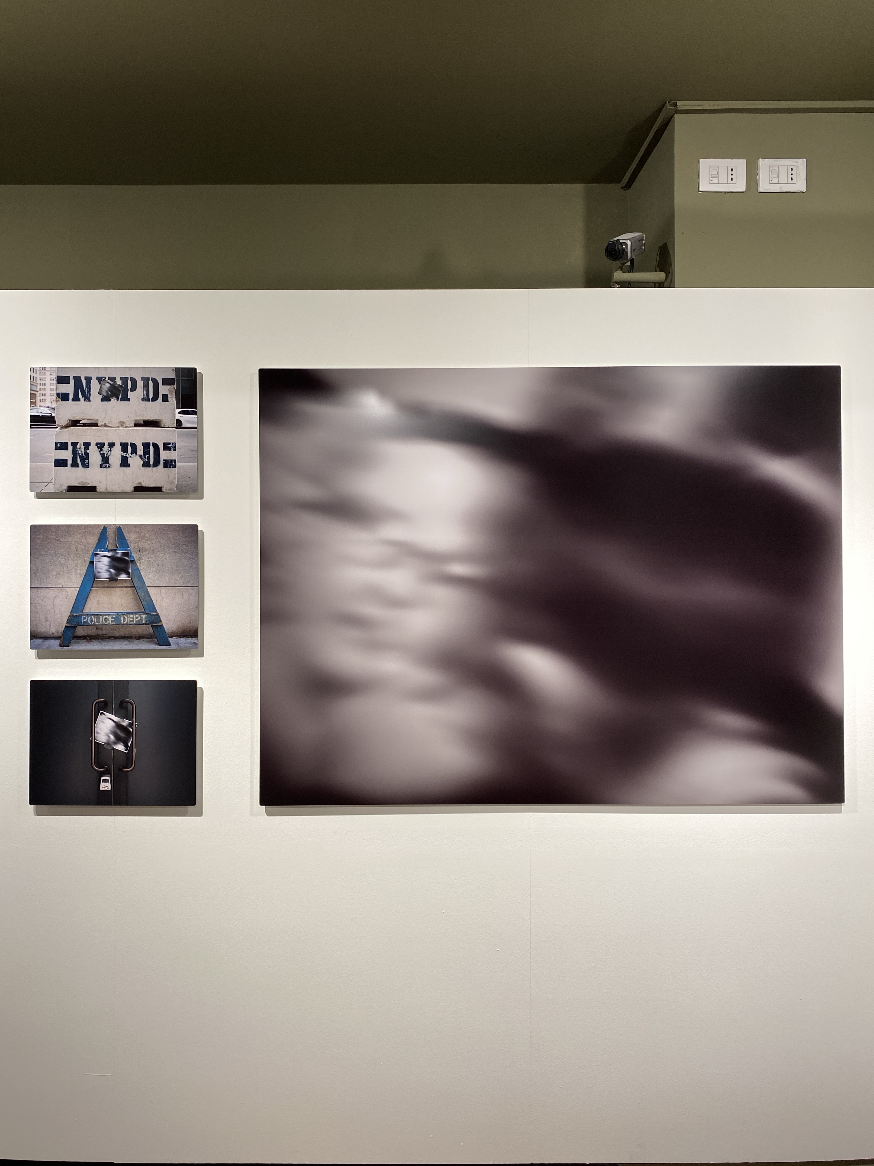 In mostra diverse opere di grande formato in cui il fotografo gioca con la mancanza di nitidezza e con la sovrapposizioni di immagini “fuori fuoco” e fortemente suggestive su altre di vita quotidiana.